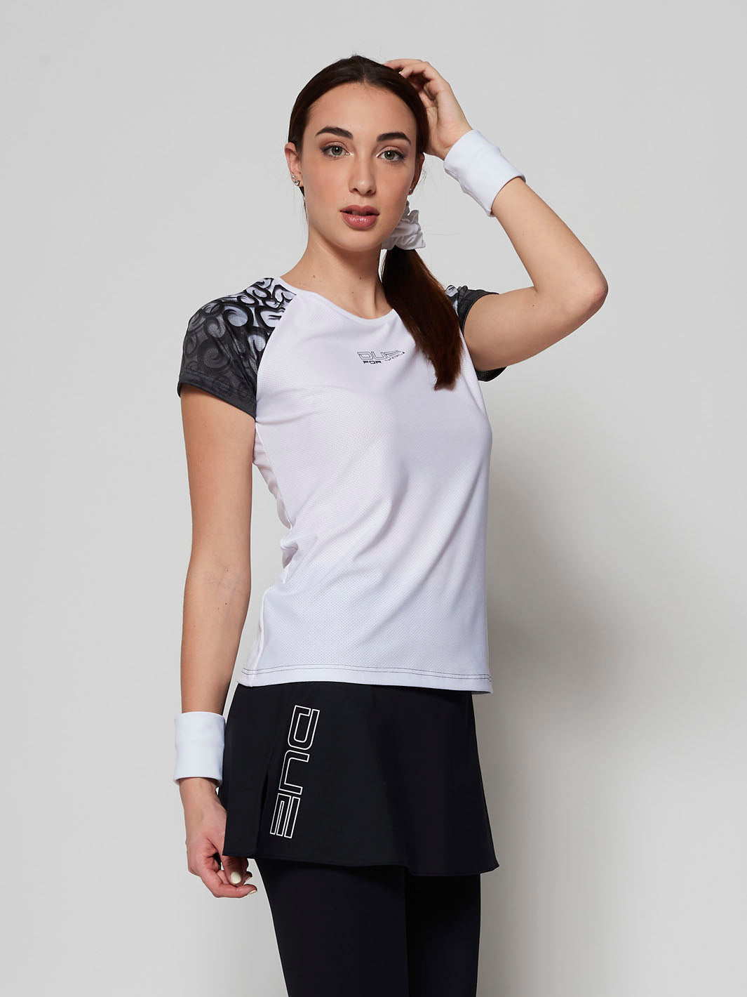 T-shirt in mesh di colore bianco per padel e tennis, scollo rotondo e manica raglan in tessuto con stampa a spirali nero degradè.